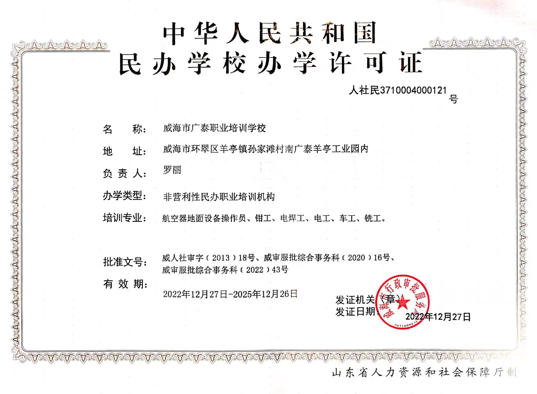 威海廣泰職業(yè)培訓(xùn)學(xué)校成立于2013年,由威海廣泰空港設(shè)備股份有限公司全資設(shè)立。 學(xué)校位于威海市環(huán)翠區(qū)羊亭鎮(zhèn)惠河路93號(hào),是經(jīng)威海市人力資源和社會(huì)保障局批準(zhǔn)成立的職業(yè)培訓(xùn)機(jī)構(gòu),具有民航特種車輛操作工、民航特種車輛機(jī)械維修工、民航特種車輛電氣維修工、鉗工、電工、焊工、車工、銑工、涂裝工、計(jì)算機(jī)操作員等工種的初、中、高級(jí)職業(yè)技能培訓(xùn)資質(zhì)。學(xué)校致力于成為民航業(yè)內(nèi)專業(yè)的技能提升培訓(xùn)服務(wù)機(jī)構(gòu),堅(jiān)持“教練結(jié)合、寓教于練”的培訓(xùn)理念,為學(xué)員提供優(yōu)質(zhì)的培訓(xùn)服務(wù)。